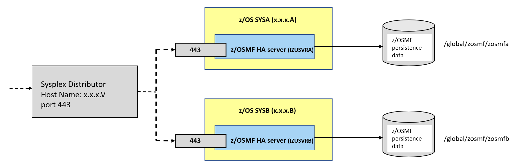 Both z/OSMF servers are bound to the DVIPA x.x.x.V. With both z/OS systems active in the Sysplex, the preferred z/OSMF server, SYSA receives all new incoming requests. If SYSA fails, new work requests for z/OSMF are routed to the server on SYSB. When SYSA resumes normal operations, new work requests for z/OSMF are routed to SYSA again. This is the default behavior because the AUTOSWITCHBACK parameter of the VIPADISTRIBUTE statement is in effect by default.
